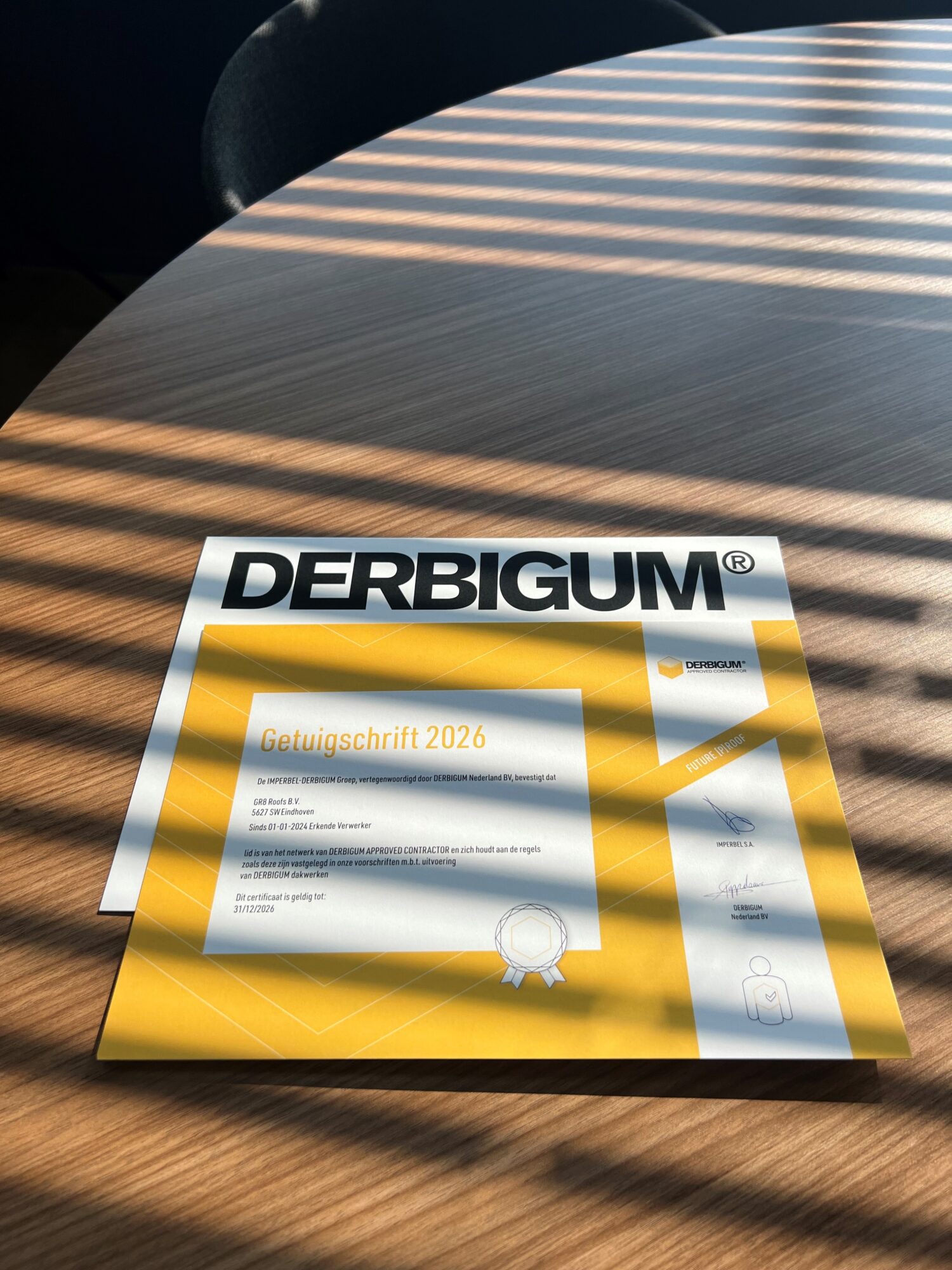 Yes, we hebben ‘m weer binnen! Ook in 2026 mogen we ons opnieuw erkend Derbigum-verwerker noemen. Het Derbigum getuigschrift is weer toegevoegd aan onze certificaten. Een mooie bevestiging van ons vakmanschap en onze focus op duurzame dakoplossingen.