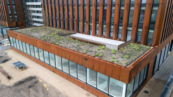 De daken zijn uitgevoerd met op hoogte verstelbare keramische tegels in combinatie met zowel extensieve als intensieve daktuinen. Door een speelse mix van vaste planten en mos-sedumbeplanting ontstaat een levendig en natuurlijk beeld. Op diverse plekken zijn banken geplaatst.